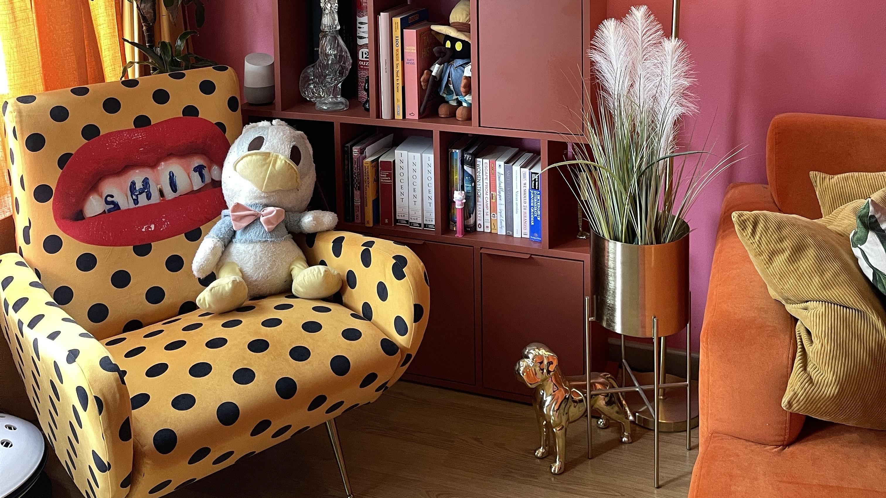Laitisen olohuoneen näyttävin huonekalu lienee nurkassa sijaitseva värikäs nuojatuoli. (kuva: Sini Laitinen)